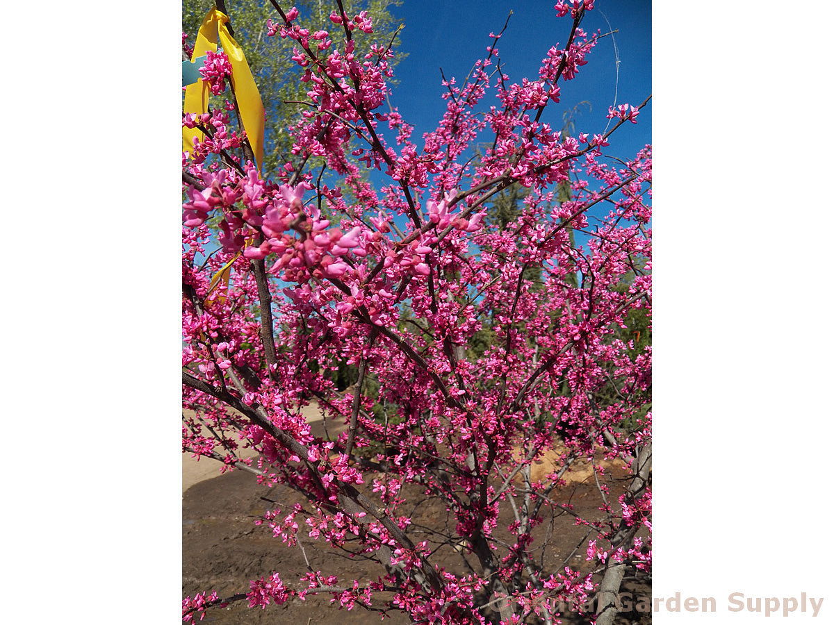Exceptional deep fuchsia red flowers emerge before foliage and profusely cover the dark branches. Blue-green leaves arrive later in spring. Fall foliage color is yellow.